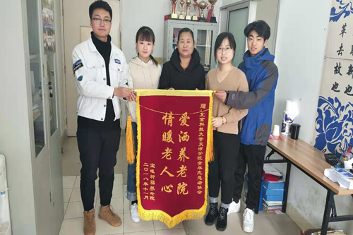 本學期活動結束后,敬老院的負責人代替老人們前來北京科技大學天津學院為青年志愿者協會送上錦旗,感謝青年志愿者協會長期以來對老人們的關心和幫助。同時敬老院的負責人與何歡歡老師、趙慧敏老師進行了親切的交談,表達了對青年志愿者協會志愿者們的肯定。