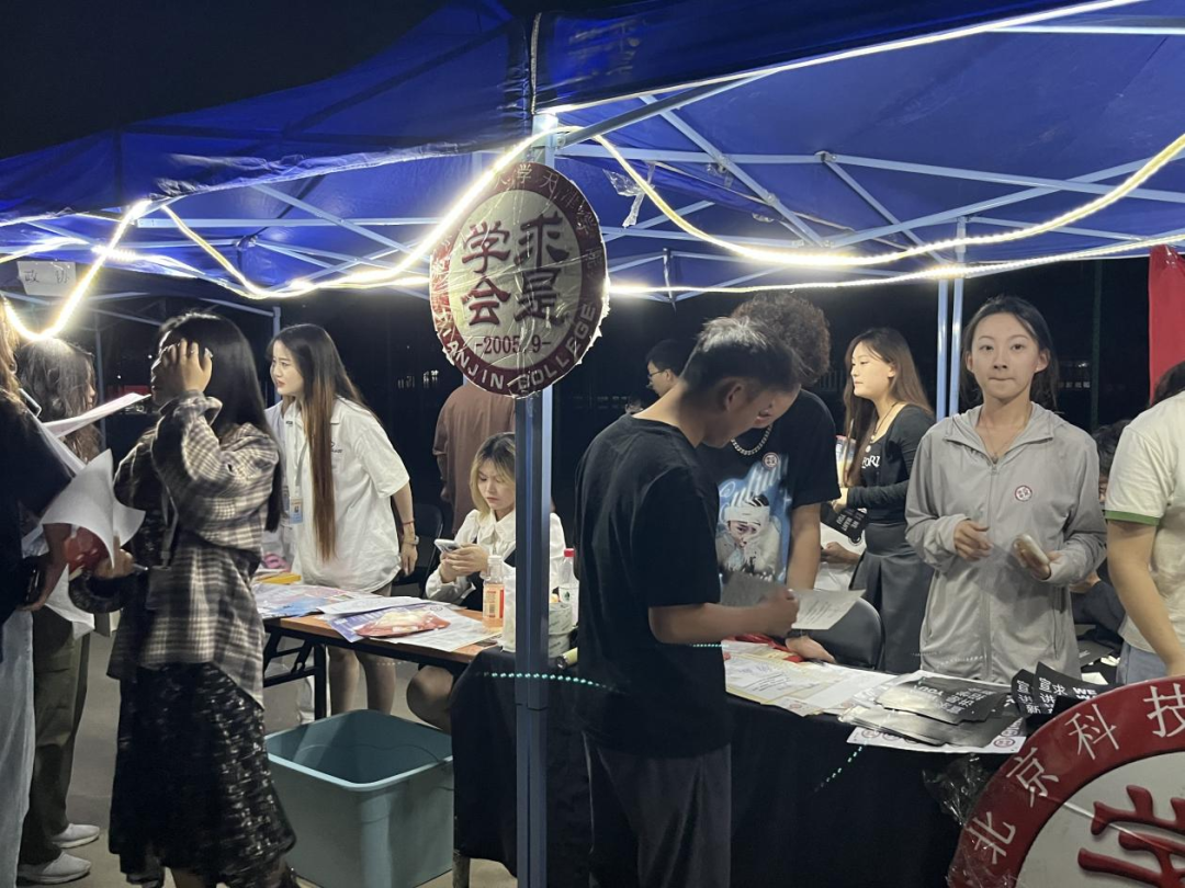 夜幕降臨,招新現場依舊熙熙攘攘,光亮的燈帶閃耀到每位同學的心中。