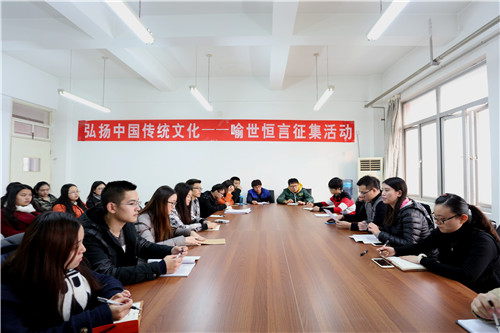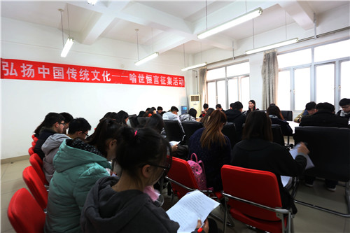 團委副書記潘柏夷首先向在場所有人員介紹了關于喻世恒言征集活動的內容和形式,告訴大家征集恒言的主題方向。而后團委書記孟祥瑜介紹了此次活動是在國家大力弘揚中國傳統文化的環境下舉辦,旨在提高大學生對傳統文化的認知和了解,集思廣益,最終甄選出百條恒言,在校園、教室進行張貼,豐富校園文化,營造學習氛圍。在場同學紛紛踴躍發言和交流,大家就征集活動所給出的主題展開了討論,發表自己的見解。