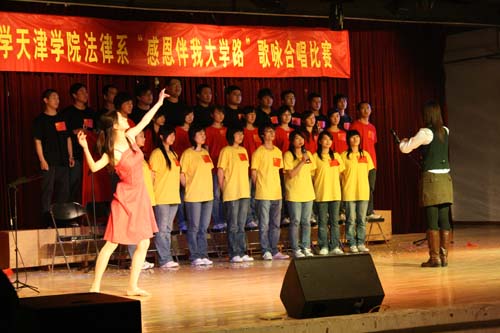 晚上7點,比賽正式開始,此次比賽以精神面貌、音樂表現(xiàn)、配合效果和形式創(chuàng)新為評分標(biāo)準(zhǔn),參賽隊伍以現(xiàn)場書法、心型燭光、伴舞合唱、懸拉橫幅、朗誦等形式和造型演繹“感恩伴我大學(xué)路”的主題,《讓世界充滿愛》、《紅旗飄飄》、《明天會更好》等曲目傳達出了法律人感恩的心聲。感人動聽的歌聲,整齊統(tǒng)一的隊伍,熱情奔放的演唱使得比賽現(xiàn)場氣氛極其熱烈,不時傳出陣陣鼓掌。跳躍的音符抒發(fā)出參賽隊伍內(nèi)心的喜悅,激昂的歌聲體現(xiàn)出法律人的颯爽英姿。經(jīng)過精彩的表演、激烈的角逐,法學(xué)064班獲得了比賽的第一名,051班、071班并列第二名,065班、073班為第三名,051班和071班獲得精神文明獎,065班和075班獲得最佳創(chuàng)意獎。