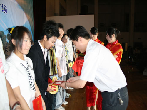 學生事務部主任盛佳偉為“校園十佳歌手”頒發獎杯和證書。