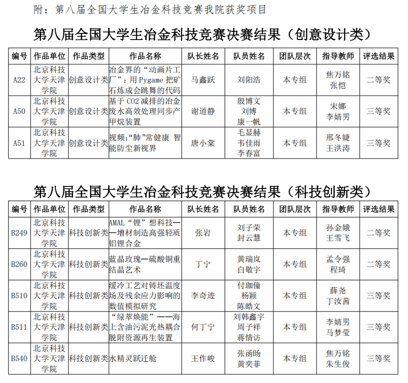 第八屆全國大學生冶金科技競賽由教育部高等學校材料類專業教學指導委員會指導,中國金屬學會和北京科技大學主辦,大賽主要面向全國冶金、材料、化工、資源、能源、環境等專業在讀的大學生和研究生,大賽的規模和質量持續提升,已成為備受矚目的全國大學生高水平競賽。本屆競賽主題是:“智能、綠色、新質、循環”,競賽單元包括:創意設計、科技創新、仿真實訓三個類別,本屆大賽共吸引全國93所高校、2384件作品參賽,其中479項作品進入決賽。金沙城js93線路檢測中心共選送23項作品參賽,經過初賽和決賽,金沙城js93線路檢測中心師生榮獲二等獎3項、三等獎5項。