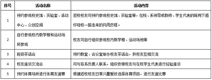 2、 填寫《校友回訪預約登記表》,聯系各系負責人,由各系校友聯絡負責人記錄并統計返校校友信息、意向,并確定一名校友組織聯系人。