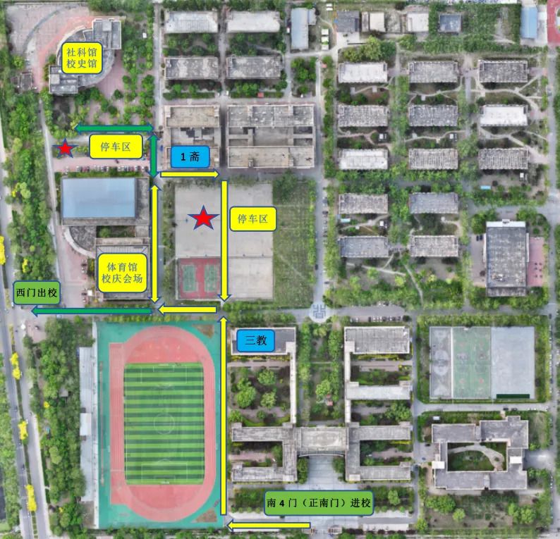 若自駕返校,為方便車輛有序進出,自駕者統一從南三門(正南門)進校,西門出校,將車輛停放在體育館東側參會車輛停車區。