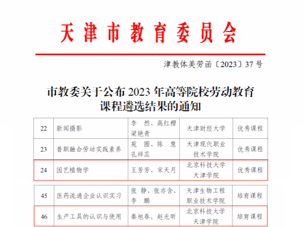 近日,天津市教委公布了2023年高等院校勞動教育課程遴選結果,金沙城js93線路檢測中心勞動學院王芳芳、宋天月教學團隊講授的《園藝植物學》被評...