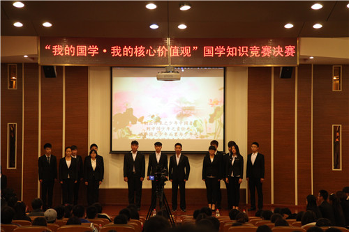11月18日晚7點(diǎn),“我的國學(xué)?我的價(jià)值觀”國學(xué)知識競賽在理工館學(xué)術(shù)報(bào)告廳正式拉開帷幕。團(tuán)委書記羅富臣、外語系黨總支書記何紅升、團(tuán)委副書記殷實(shí),田勇、圖書館讀者咨詢部主任王妙麗、團(tuán)委各部部長、分團(tuán)委書記及二百多名學(xué)生參加此次活動(dòng)。決賽分為五輪答題,分別為團(tuán)隊(duì)必答題、個(gè)人必答題、60秒快速問答題、觀眾互動(dòng)答題和兩輪風(fēng)險(xiǎn)題,答題結(jié)束后,如出現(xiàn)同分隊(duì)伍則進(jìn)行附加賽。比賽正式開始前,孝心社孫燁同學(xué)做“我的國學(xué)?我的價(jià)值觀”主題演講,詮釋了國學(xué)與核心價(jià)值觀之間的緊密聯(lián)系。必答題環(huán)節(jié)開始后,參賽隊(duì)員略顯緊張,但很快就進(jìn)入了比賽節(jié)奏,四支參賽隊(duì)伍表現(xiàn)都十分優(yōu)異,必答題結(jié)束后,院學(xué)生會泓涵隊(duì)以微弱優(yōu)勢領(lǐng)先。之后,由廣播站和孝心社13名同學(xué)朗誦《少年中國說》,“少年智則中國智,少年強(qiáng)則中國強(qiáng)”,慷慨激昂的聲音在報(bào)告廳久久回響,激勵(lì)了同學(xué)們立志成才、報(bào)效祖國,現(xiàn)場時(shí)時(shí)爆發(fā)雷鳴般的掌聲。60秒快速問答環(huán)節(jié),現(xiàn)場觀眾屏息凝神,在最后一支隊(duì)伍答題完畢后,現(xiàn)場爆發(fā)了熱烈的掌聲,觀眾無不為主持人的反應(yīng)敏捷和答題選手的博學(xué)多才所折服??焖賳柎瓠h(huán)節(jié)結(jié)束后,院學(xué)生會泓涵隊(duì)的領(lǐng)先優(yōu)勢繼續(xù)擴(kuò)大。觀眾答題環(huán)節(jié),主持人與觀眾的互動(dòng)稍稍緩解比賽的緊張氣氛。而緊張刺激風(fēng)險(xiǎn)題環(huán)節(jié),把整個(gè)活動(dòng)推向高潮,現(xiàn)場時(shí)時(shí)爆發(fā)熱烈的掌聲為回答正確的同學(xué)祝賀,也為答錯(cuò)扣分的隊(duì)伍扼腕嘆息。兩輪風(fēng)險(xiǎn)題結(jié)束后,學(xué)生藝術(shù)團(tuán)民樂團(tuán)的三名同學(xué)為觀眾獻(xiàn)上古箏彈奏《漢江韻》,熱烈歡快的曲調(diào)讓同學(xué)們深深體會了中華傳統(tǒng)文化的魅力。