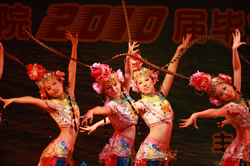 晚會以“云水約定”為主題,分為“云水記憶”和“約定未來”兩個篇章。本次畢業(yè)生文藝晚會舞臺設(shè)計(jì)新穎,在主舞臺前方延伸出正方形副舞臺,在副舞臺兩側(cè)還安排2010屆畢業(yè)生觀眾,加強(qiáng)了表演者與觀眾的交流。隨著管弦樂合奏的徐徐響起,晚會正式拉開帷幕。激情昂揚(yáng)的《加勒比序曲》,節(jié)奏歡快的《五聲神韻》,將現(xiàn)場觀眾的熱情充分調(diào)動起來。熱烈的掌聲中,我們迎來了晚會的第一個節(jié)目歌伴舞《美麗的草原我的家》。演唱者行云流水般的歌聲,讓人感覺仿佛置身于草原之中,體驗(yàn)著那份清新與自然,享受草原的寧靜。接下來是由學(xué)生藝術(shù)團(tuán)帶來的舞蹈《俏花旦》,它以中國傳統(tǒng)方式京劇為淵源,用不同于京劇表演的全新方式演繹而來。表演者動作靈活敏捷,宛如一個個舞動的精靈。