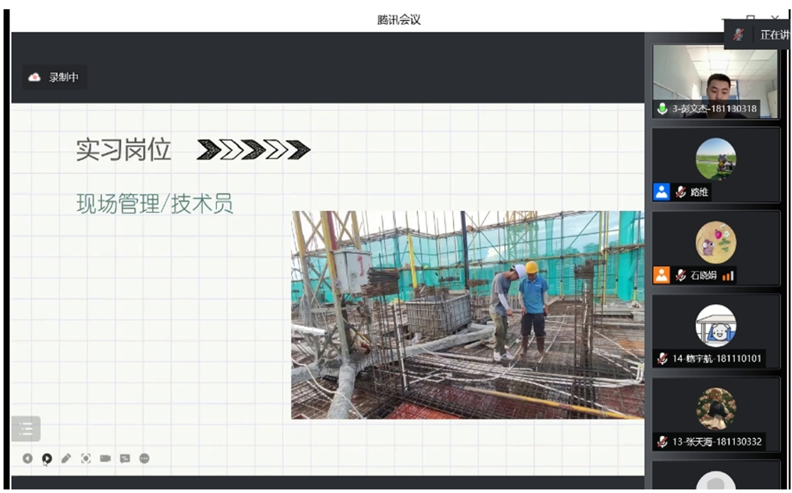 答辯前各組師生根據學院要求認真準備答辯材料,模擬答辯流程,調試錄屏設備及會議軟件,為答辯的順利進行做好充足準備。答辯過程中學生采用共享屏幕的方式,對實習過程中所從事的崗位、工作內容以及實習過程中遇到的困難進行了匯報,大部分同學前往企事業單位實習,并從事與土木相關的工作,如工程質量檢測、工程造價管理、工程監理等,在實習的過程中將大學所學專業知識與工程實踐有機的結合,對自己所學的內容有了深入的了解,并認識到自己的不足,在工作中仍需繼續不斷學習;還有部分同學在與專業相差較大的單位實習,如12345服務熱線,通過接聽市民各種反饋意見,亦感受到了生活的酸甜苦辣,這段不尋常的經歷也代表著邁入社會的第一步。此外,部分學生根據實習中所遇到的問題,對相關課程在教學時提出了一定的期許,為日后城市建設學院的課程建設提供了強有力的依據。