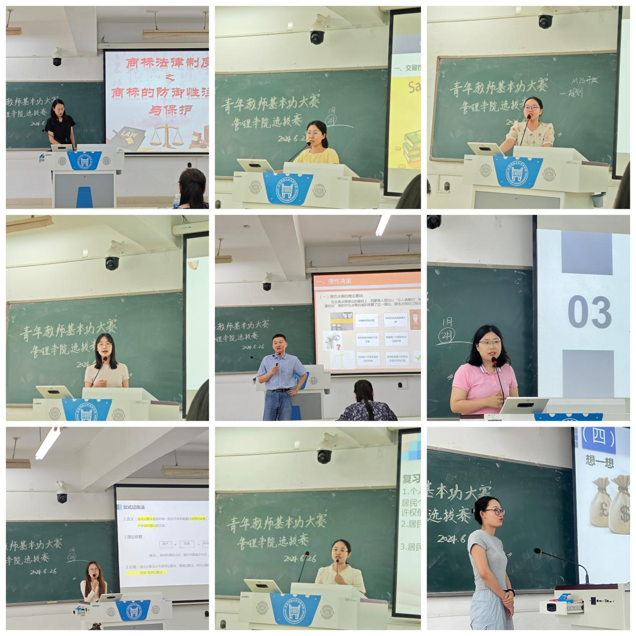 為貫徹落實新時代全國高等學(xué)校本科教育工作會議精神,引領(lǐng)廣大青年教師潛心教書育人,不斷轉(zhuǎn)變教育教學(xué)理念,更新教學(xué)方法和教學(xué)手段,提升教學(xué)能力和水平,管理學(xué)院于2024年6月26日下午14點在8教102舉辦了第十六屆青年教師教學(xué)基本功大賽預(yù)賽。管理學(xué)院常務(wù)副院長王賓容老師及管理學(xué)院全體教師參加預(yù)賽,由管理學(xué)院副院長王曉欣老師主持,并特邀督導(dǎo)尤志華老師給予指導(dǎo)。