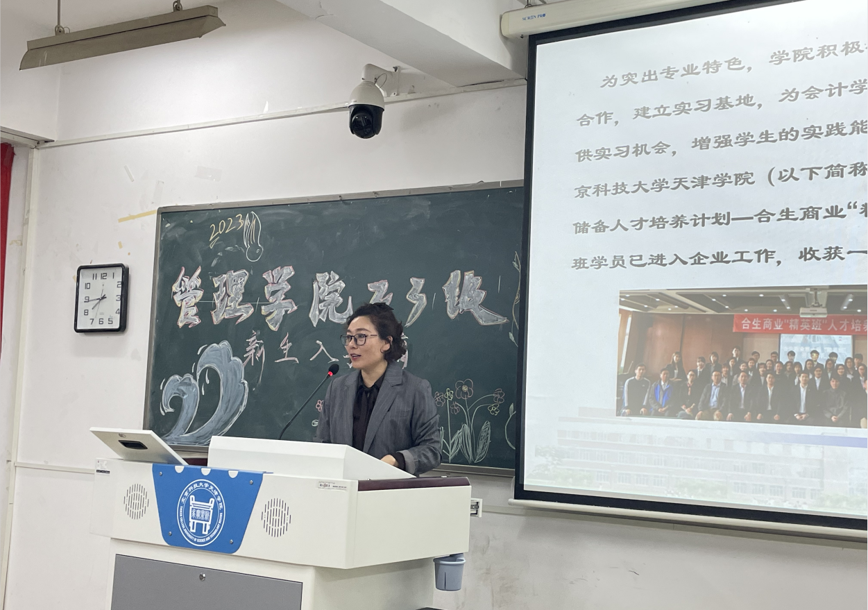 管理學院副院長王曉欣老師向大家介紹了管理學院的17位專職教師,向2023級同學們詳細介紹了各位老師所帶的專業(yè)課程以及實驗建設情況。