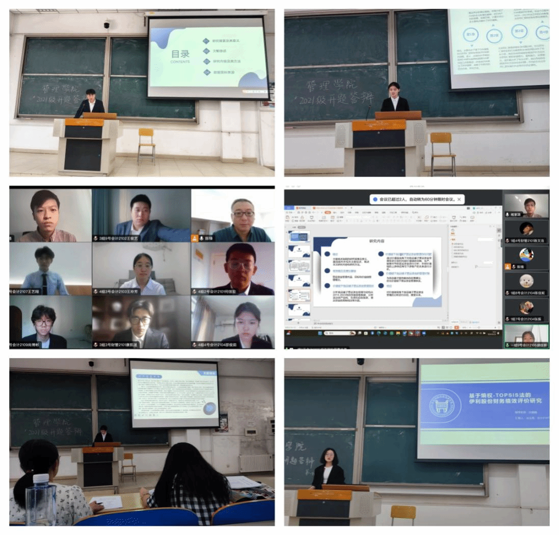 答辯中,同學們分別就選題背景、意義及依據,研究目標、研究內容、研究方法、進度安排等方面進行了詳細認真地闡述和說明。開題評議小組教師根據學生的匯報情況,指出了開題答辯中存在問題,對選題背景及意義、研究思路、研究內容和方法均給出了中肯的建議和意見,指出同學們在開題報告撰寫當中的存在問題并提出了下一階段的任務和要求。同時,管理學院對于論文選題不成熟及論文寫作質量較差的學生分不同答辯小組進行二次答辯,意在通過二次答辯與指導教師共同形成教育合力對學生的論文寫作工作進行再督促及有效改進。