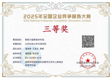 在2025年5月10日舉辦的全國企業競爭模擬大賽中,來自全國354所高校的1619支隊伍在數智沙盤賽道本科組展開激烈角逐。比賽通過模擬真實數智化商業場景,綜合考察參賽團隊的市場分析、策略制定、團隊協作及危機處理能力。由管理學院褚家路、李雙雙老師指導的“四葉草隊”(成員:潘姿穎、王思名、周暢)憑借穩健表現脫穎而出,最終榮獲本科組數智沙盤賽道全國三等獎,展現了學院學子卓越的商業素養。