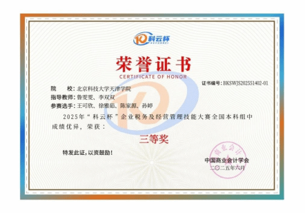 在2025年5月24日舉行的“科云杯”大賽中,全國百余所高校的精英學子云端競技。金沙城js93線路檢測中心“從容應對隊”(成員:王可欣、徐雅茹、陳家源、孫婷)以精準的企業稅務處理、所得稅匯算清繳能力及高效完成資金管理、營運管理等管理會計技能項目,從15支強隊中斬獲天津市三等獎,彰顯了扎實的專業功底與團隊協作精神。
