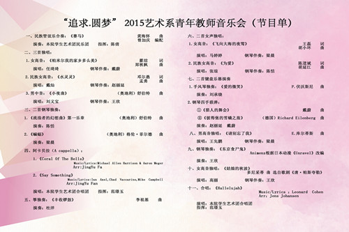 2015年12月9日18:30,北京科技大學天津學院藝術系青年教師音樂會在12教學樓弘藝音樂廳舉行。藝術系主任胡建華、外語系主任梁素琴、材料系主任沈衛平、教務處副處長李遠、基建后勤處副處長彭鵬、信息系黨總支書記柯瑜、法律系黨總支書記馮海燕、藝術教育中心主任林碧蕓出席了本次音樂會。