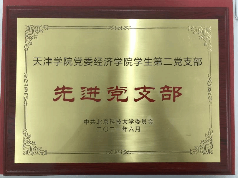 在黨的百歲誕辰之際,2021年6月30日,北京科技大學隆重召開“兩優一先”表彰大會,北京科技大學天津學院經濟學院學生第二黨支部榮獲“先進黨支部”榮譽稱號。