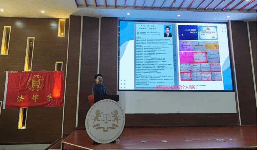 2017屆法學專業(yè)畢業(yè)生孔龍從自己的校園成長之路講起,感嘆再次站上學術報告廳演講臺的心情變化。之后與學弟學妹們分享了自己的學生干部、考研備考、學術科研、律所工作和戀愛家庭的經(jīng)歷,用自己畢業(yè)后學習、生活、工作的經(jīng)歷來鼓勵同學們堅守理想、錘煉本領、發(fā)揮所長、不斷奮進、永不言敗,讓人不禁感嘆努力的人自帶光芒。
