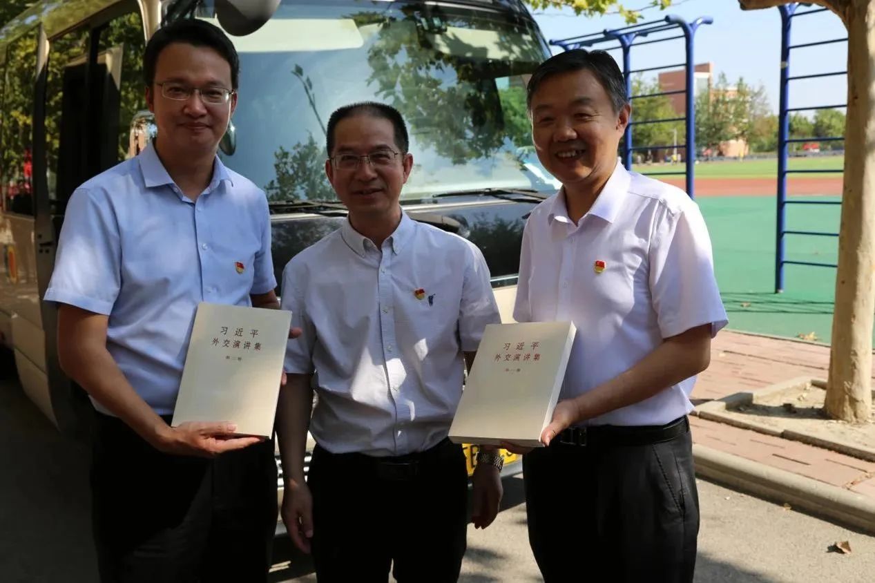 楊明偉局長(zhǎng)向?qū)W院贈(zèng)送《習(xí)近平外交演講集》,學(xué)院院長(zhǎng)丁煦生、黨委書記葉振楠代表學(xué)院接受贈(zèng)書。
