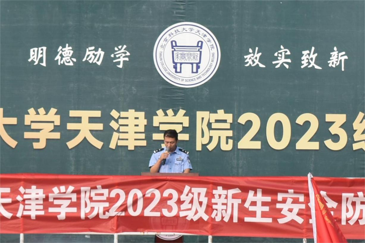 為幫助新生樹立安全理念,提升安全防范意識,增強自我保護能力,9月16日上午,學院邀請京津新城派出所所長李立軍警官、京津新城派出所民警丁玉東警官在學院西操場軍訓現場,為2023級4400余名新生開展安全防范知識專題講座。