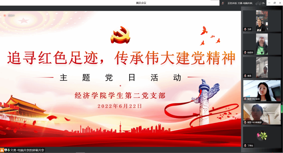 為激勵廣大黨員堅定理想信念,不忘初心、牢記使命,重溫黨的光輝歷史,繼承和發揚黨的光榮傳統和優良作風,進一步增強黨的凝聚力和戰斗力,6月22日,經濟學院學生第二黨支部通過騰訊會議線上形式開展2022年第六次組織生活和“追尋紅色足跡,傳承偉大建黨精神”主題黨日活動。天津學院院長、黨委書記丁煦生與黨支部全體師生黨員參加,此次活動由黨支部書記文勇同志主持。
