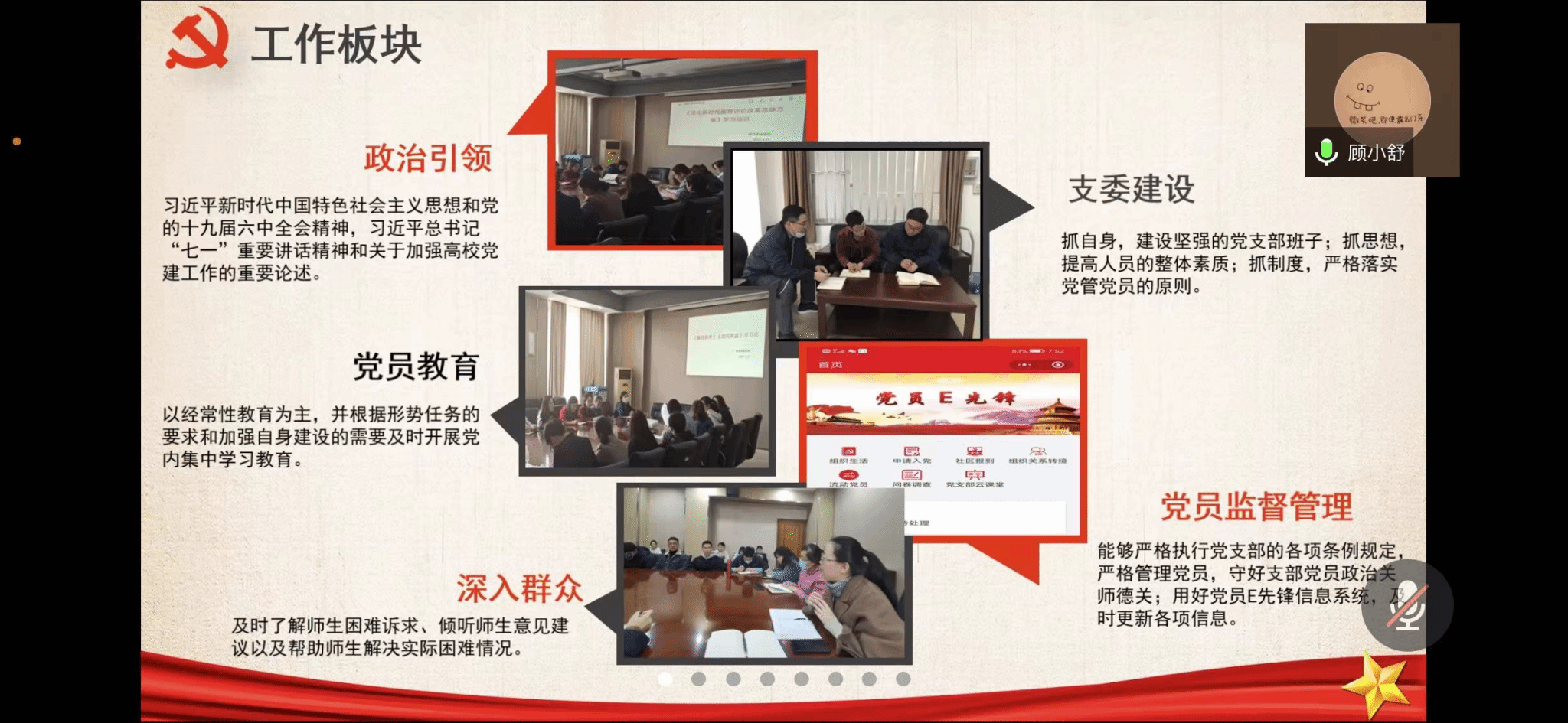 黨委書記丁煦生同志在總結講話中提到,各支部的特色要繼續保持發揚,要持續提升黨員教育和管理的能力,嚴格把控黨員質量。同時,要求各黨支部不斷增強基層黨組織凝聚力和戰斗力,持續提升黨支部工作質量,推動黨支部規范化建設工作穩步前進,切實落實好基層黨組織建設的各項任務和要求,多向優秀的支部學習吸納經驗,相互學習合作,共同進步,形成推動學院基層黨建工作更快、更好發展的強大合力。