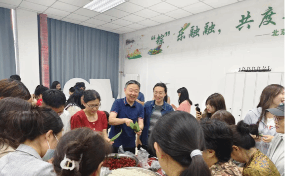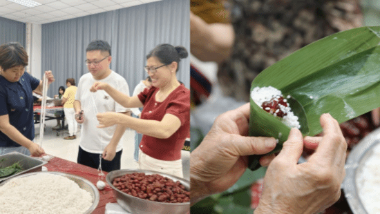 在乒乓球活動室開展的是“巧手包粽子”活動,現場準備了粽葉、糯米、蜜棗、大棗、繩子等食材和工具,在經驗豐富的教職工指導下,大家折粽葉、裝糯米、放紅棗、裹扎繩,教職工們圍在一起,一邊包粽子,一邊交流端午的由來、習俗等中華優秀傳統文化知識,氣氛歡樂祥和,其樂融融。