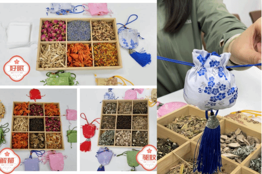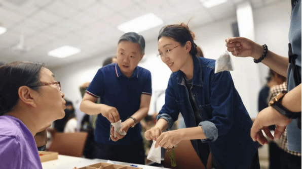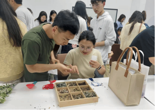 在勵學坊開展的是“五彩繩編織”和“古法香囊DIY”活動,現場準備了五彩繩、各類小配飾,香料、荷包等工具。教職工或獨自鉆研,或互相交流,五彩絲線在指尖穿梭,很快編出了精美的繩結;在“古法香囊DIY”環節,現場有菖蒲片、薰衣草、川佛手等18種中藥材,分為解郁、好眠、驅蚊三種套餐供大家選擇,經過教職工們的精心制作,一個個散發著清幽藥香、造型別致的香囊便新鮮出爐。