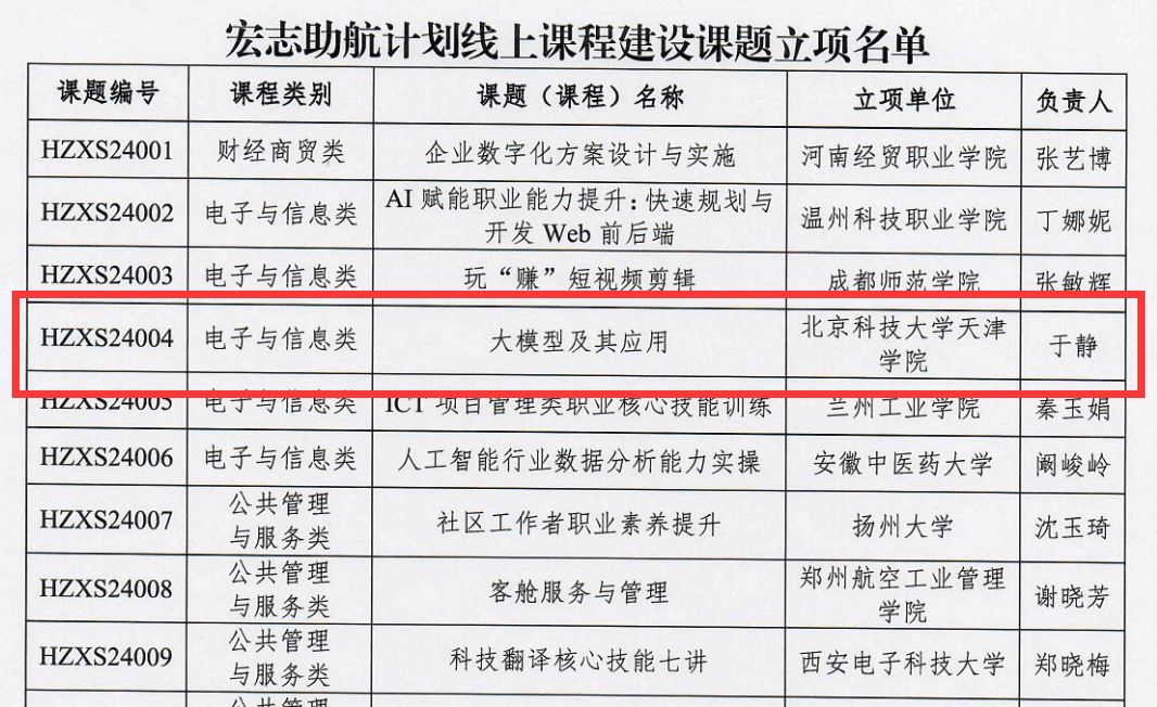 近日,教育部學(xué)生服務(wù)與素質(zhì)發(fā)展中心公布“宏志助航計劃”線上課程建設(shè)課題立項名單,由信息工程學(xué)院副院長于靜教授主持申報的《大模型及應(yīng)用》課程獲批立項,為我校首次獲得該項目立項。項目組成員來自無人系統(tǒng)與具...